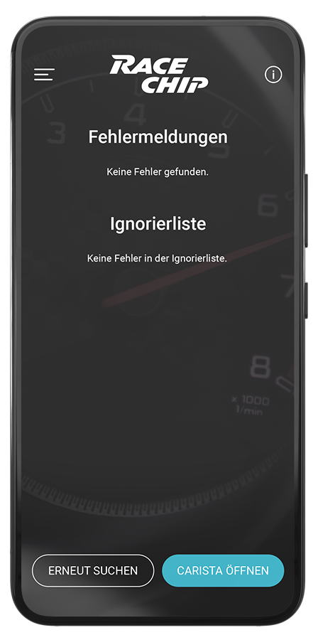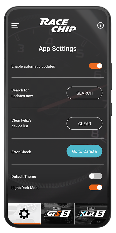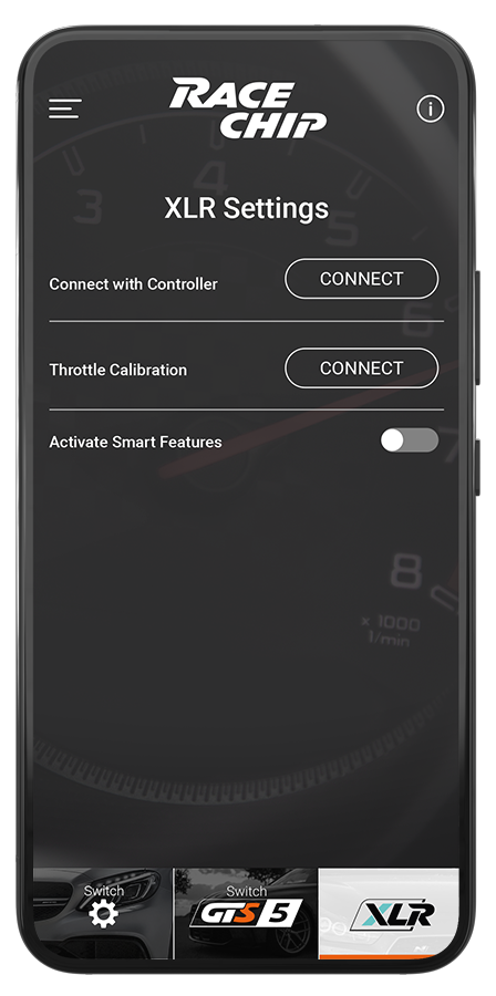 The Race Chip app lets you set up your car as you want; just select the tuning stage from your smartphone. The app can also deactivate the RaceChip, returning the car to stock tune. App control for your RaceChip is available for just na EUR. The RaceChip App (na EUR option) lets you tune your car as you want; just select the tuning stage from your smartphone. The chip can be deactivated for stock tune.